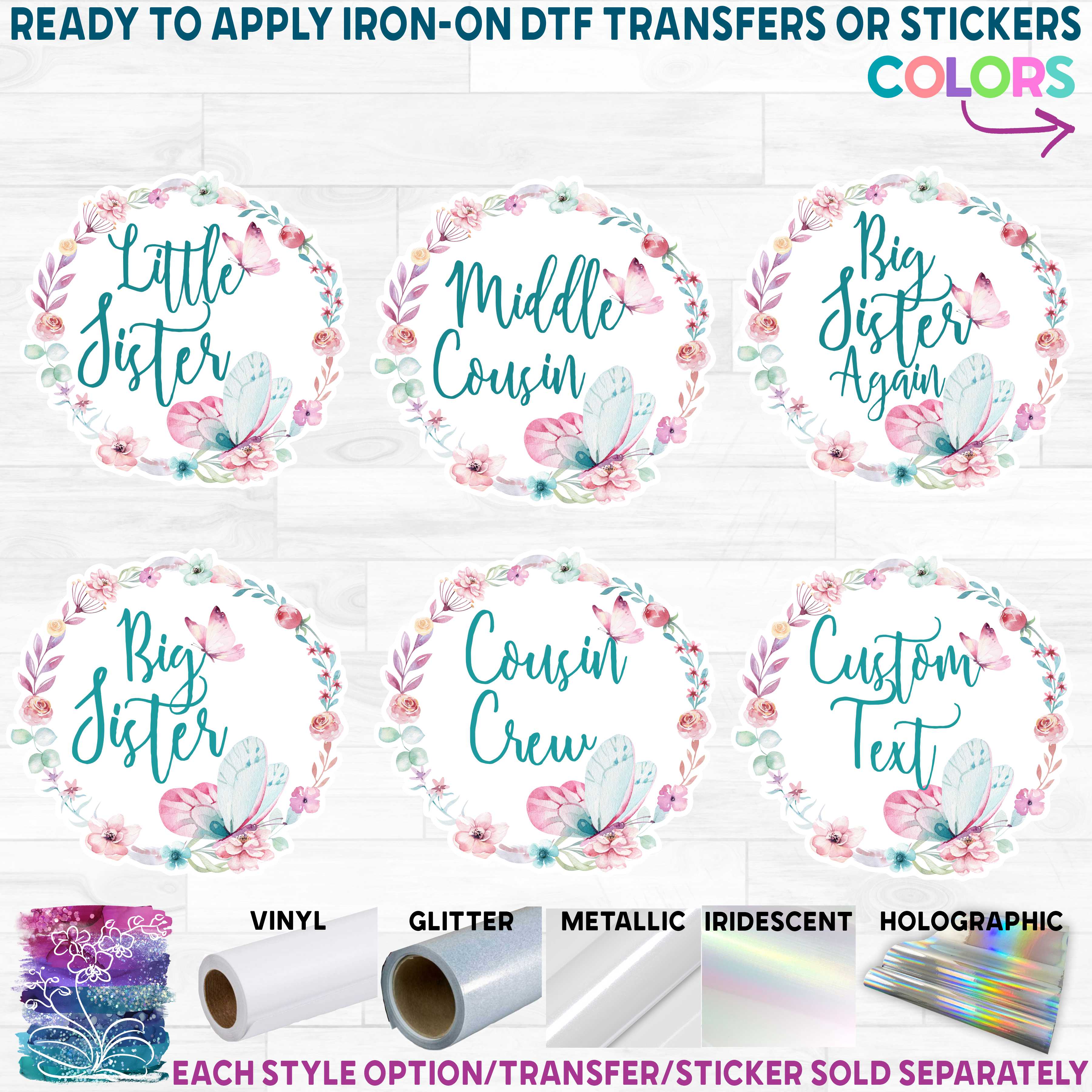Item No. (199-A) Big Sister, Little Sister, Custom Text Butterfly Floral Flowers Watercolor